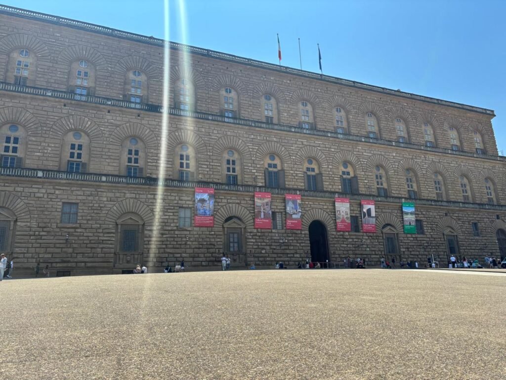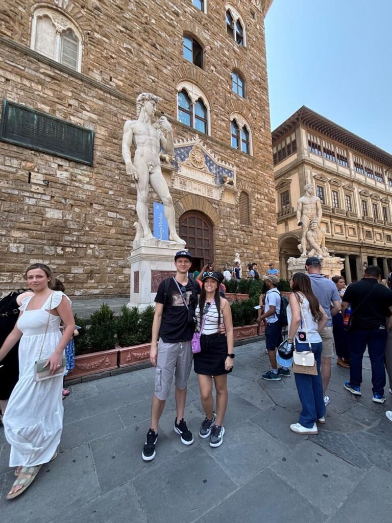 A praça central de Florença é um dos pontos mais icônicos da cidade. Ali está o imponente Palazzo Vecchio, sede do governo florentino desde a Idade Média, além de várias esculturas históricas expostas ao ar livre. Entre elas, destaca-se a famosa réplica da estátua de David, de Michelangelo, colocada exatamente no local onde a obra original ficou até ser transferida para a Galleria dell’Accademia, garantindo que os visitantes ainda possam apreciar sua grandiosidade no coração da cidade.